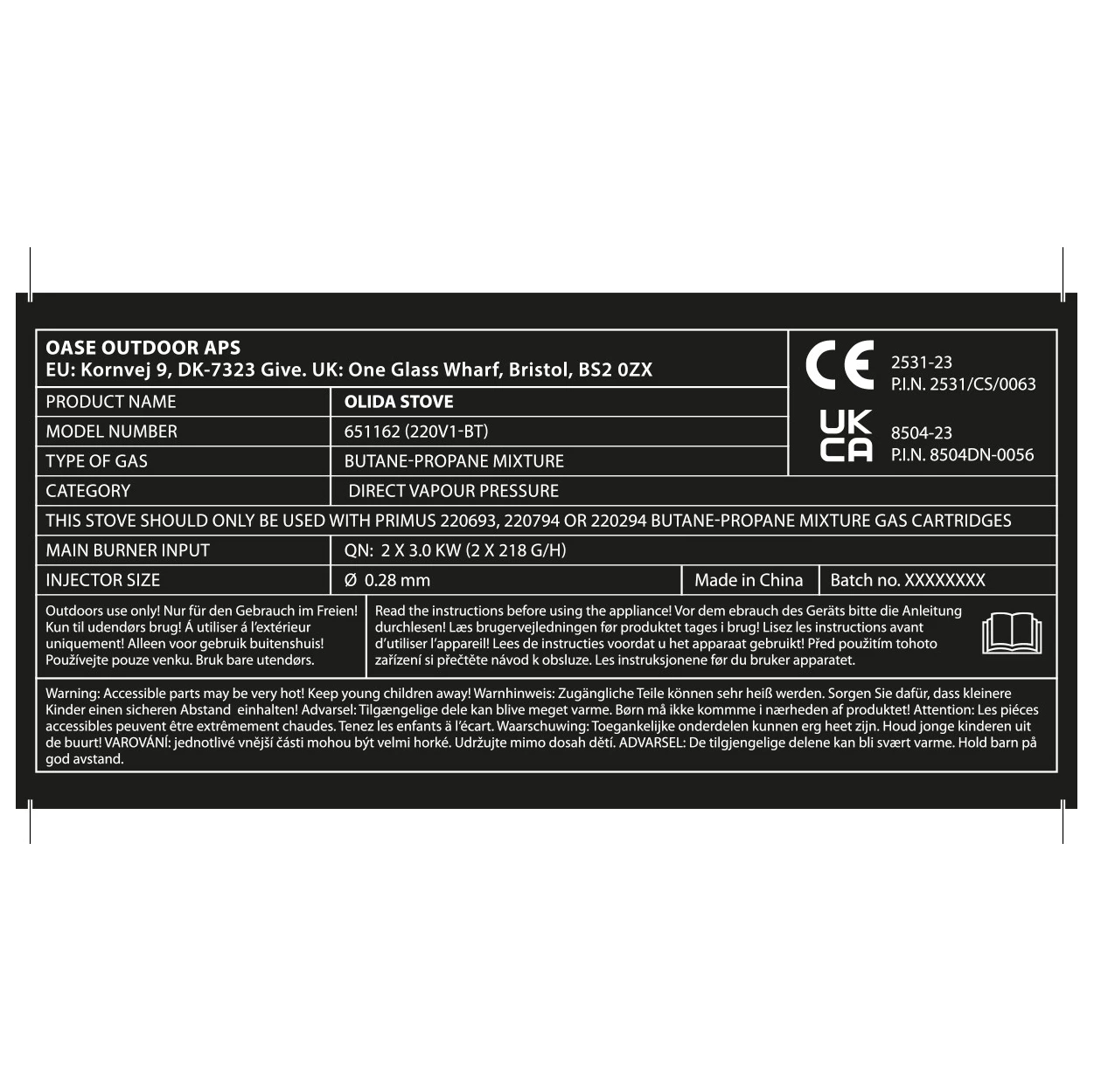 The gas stove is operated with a standard EN417 screw-in cartridge and has a piezo ignition system that enables you to turn on the stove quickly and easily at the touch of a button. The included PVC hose with the automatic shut-off function eases handling and perfectly rounds off the design.